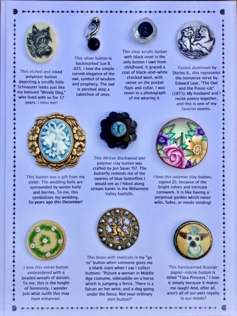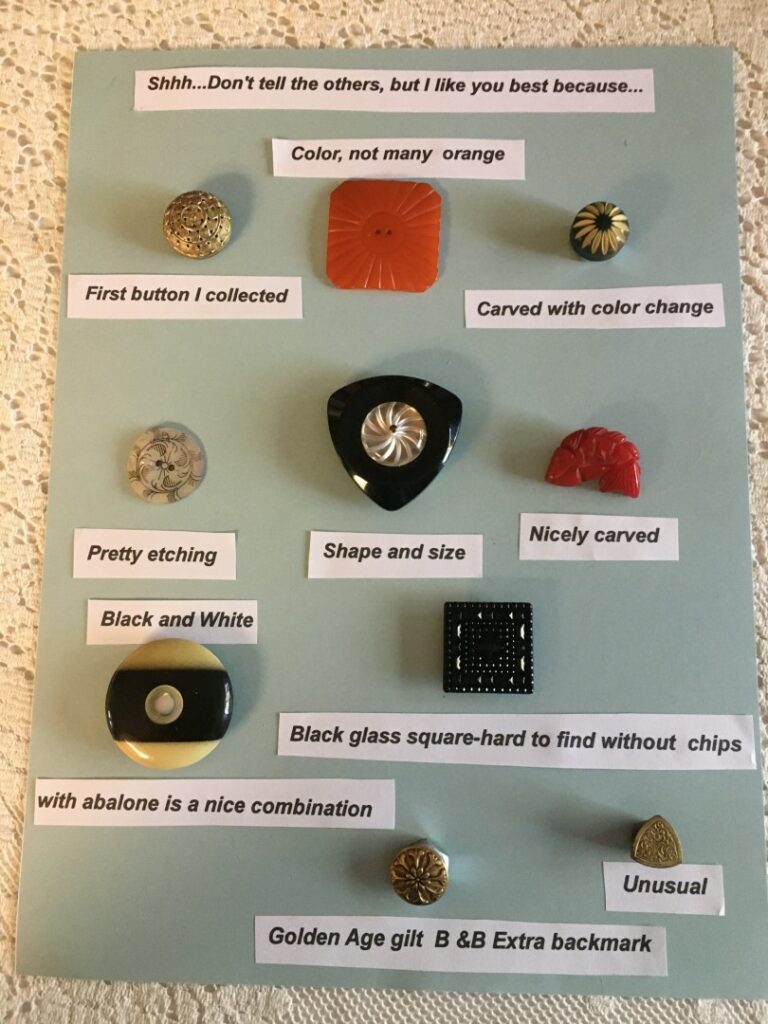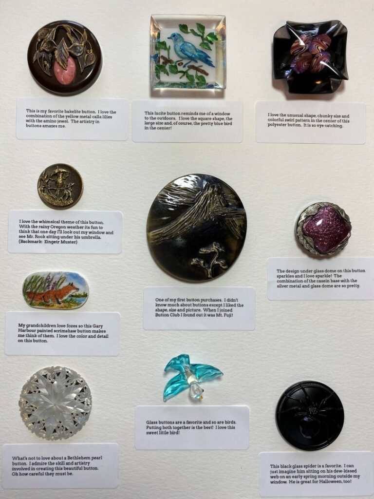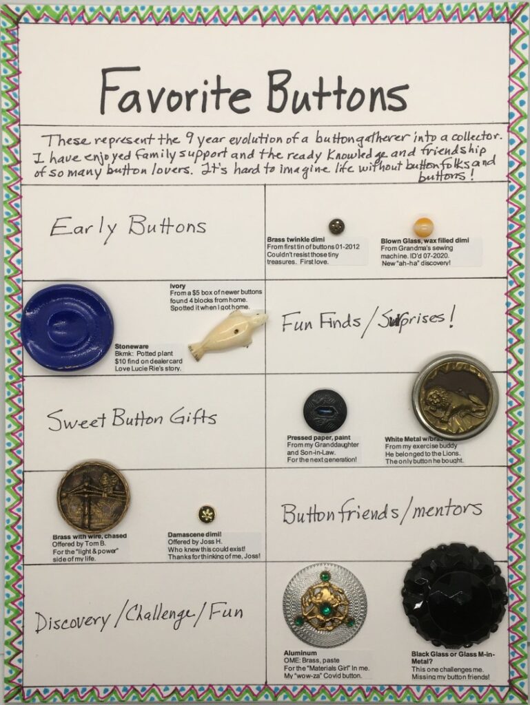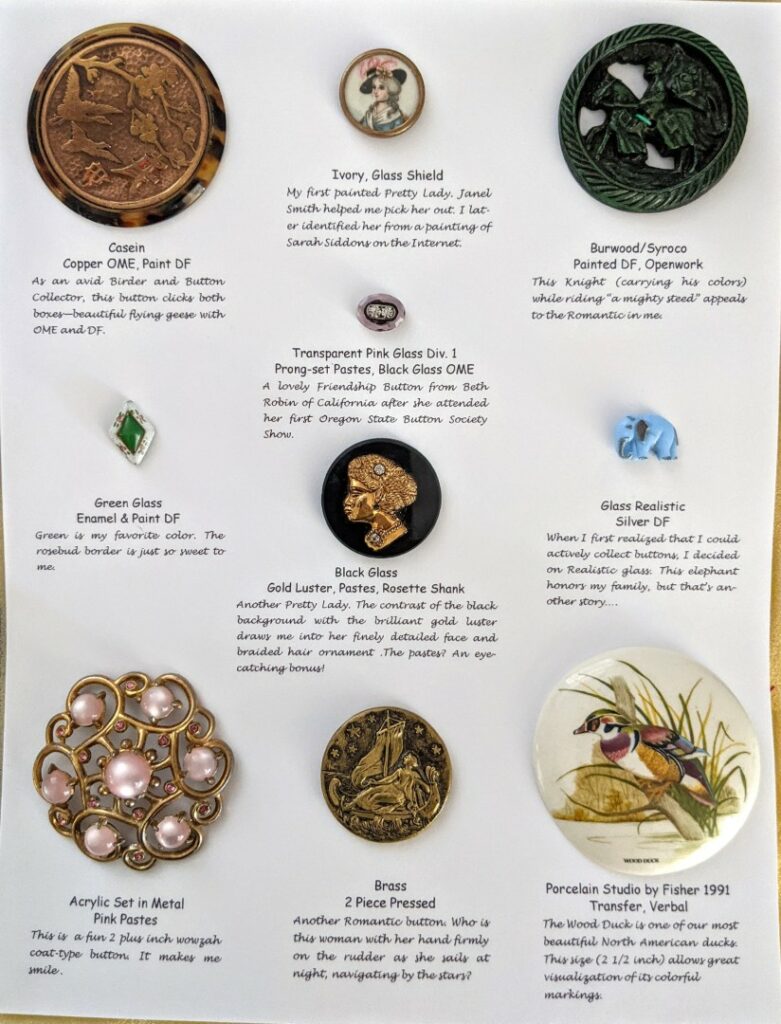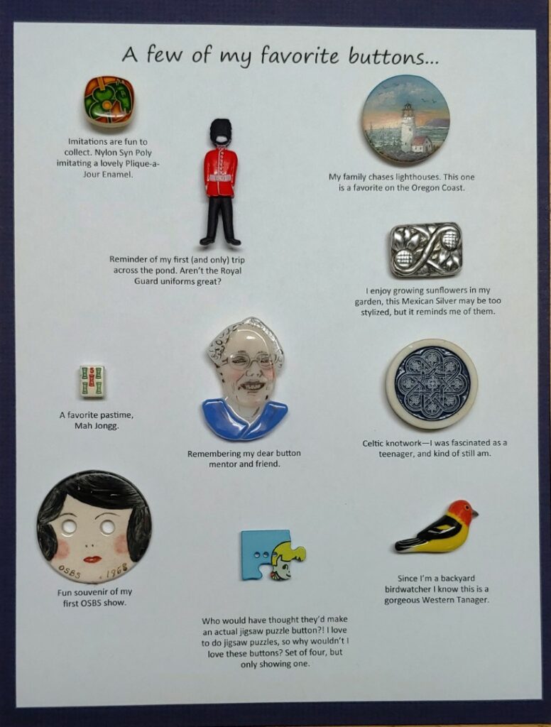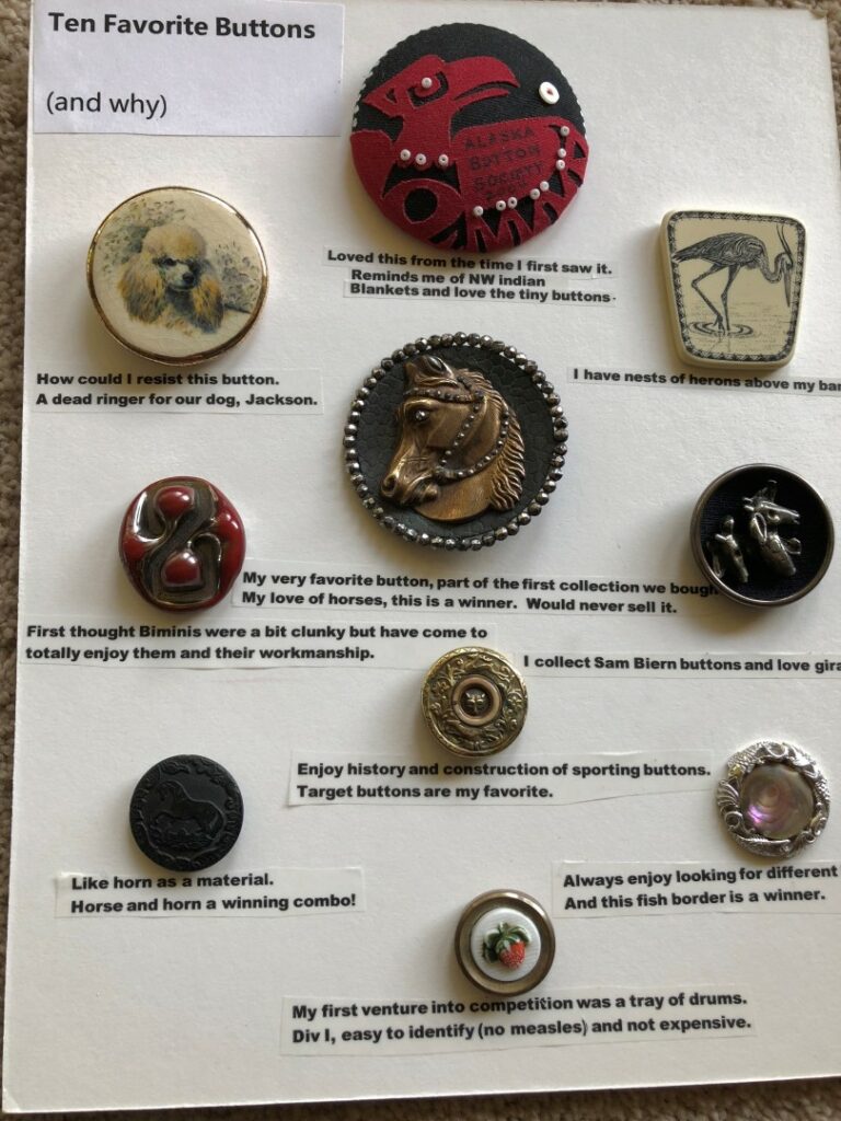 Award 4: Div. VI. 10 ANY. Ten of your favorite buttons, with a written explanation telling why each is a favorite. Joy Journeay. Button prize to each entrant.
