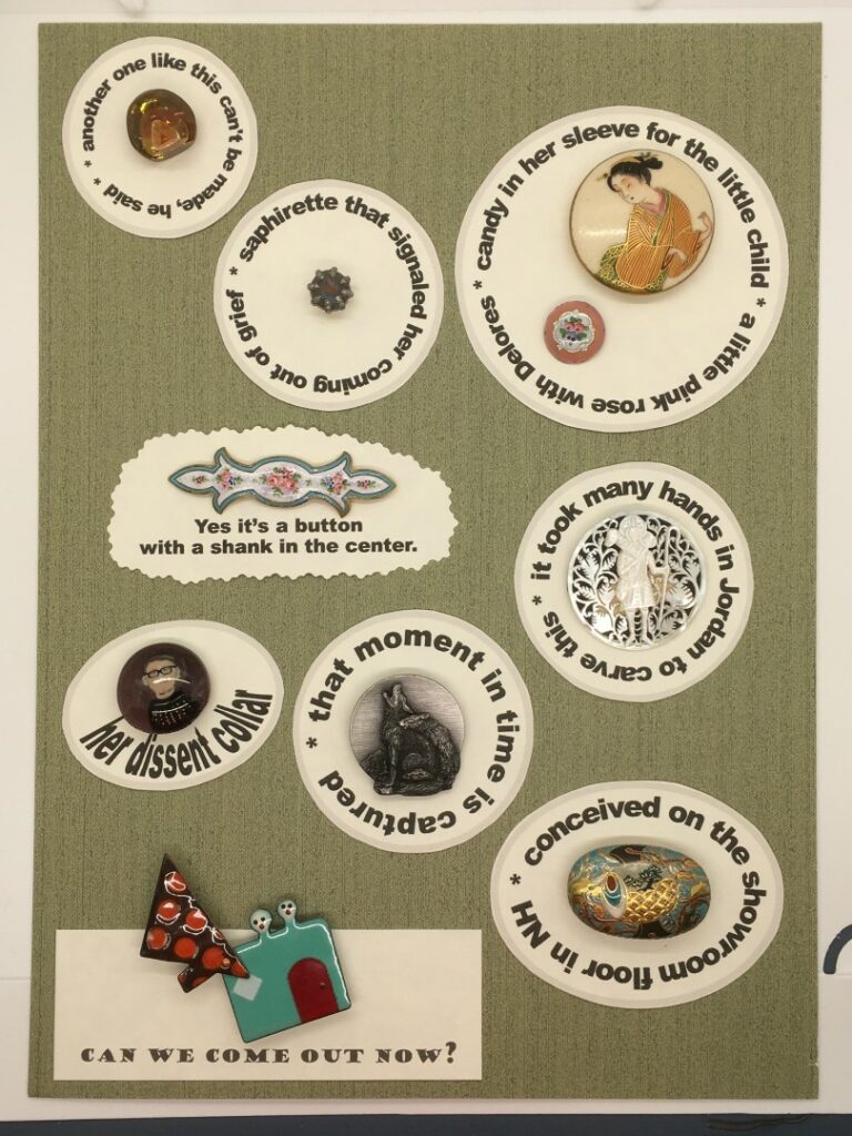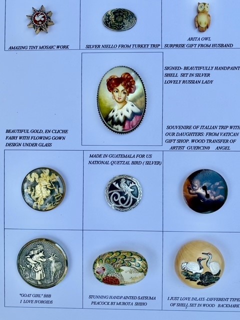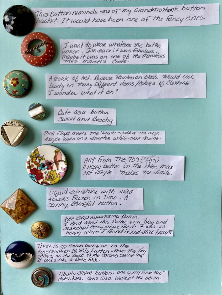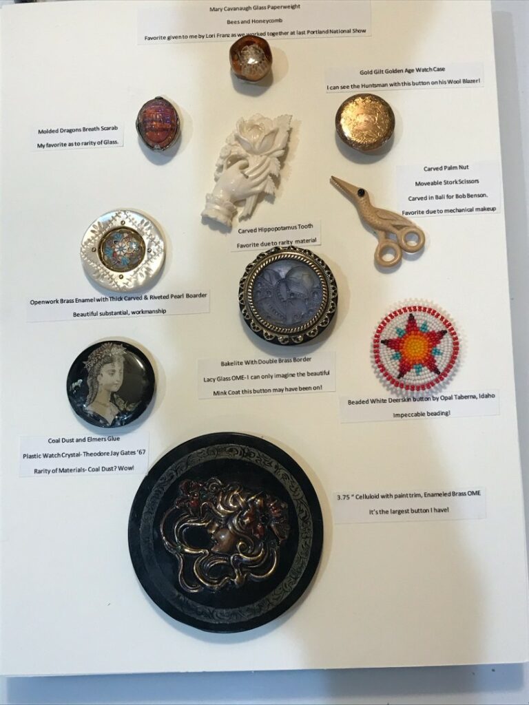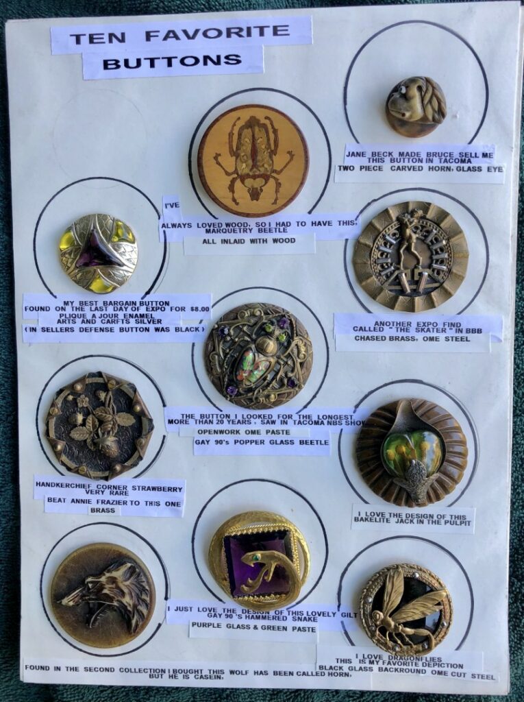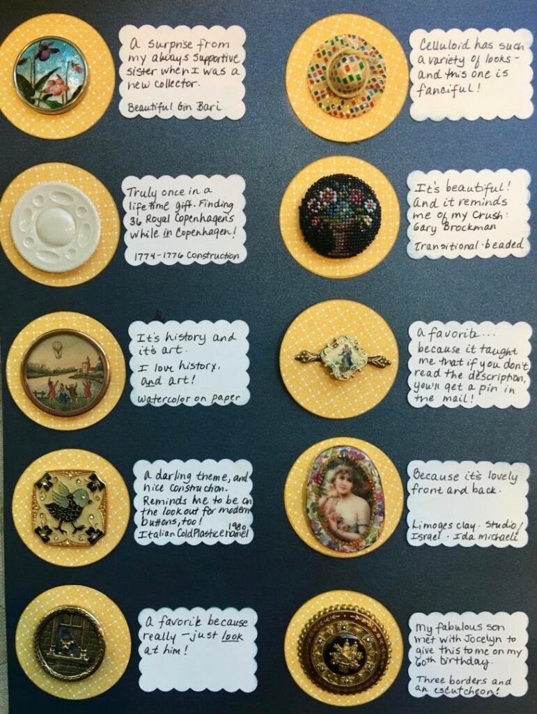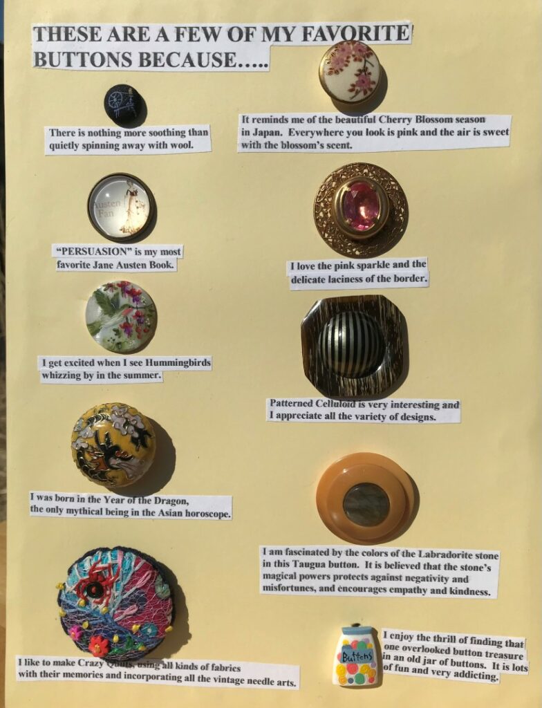 Award 4: Div. VI. 10 ANY. Ten of your favorite buttons, with a written explanation telling why each is a favorite. Joy Journeay. Button prize to each entrant.